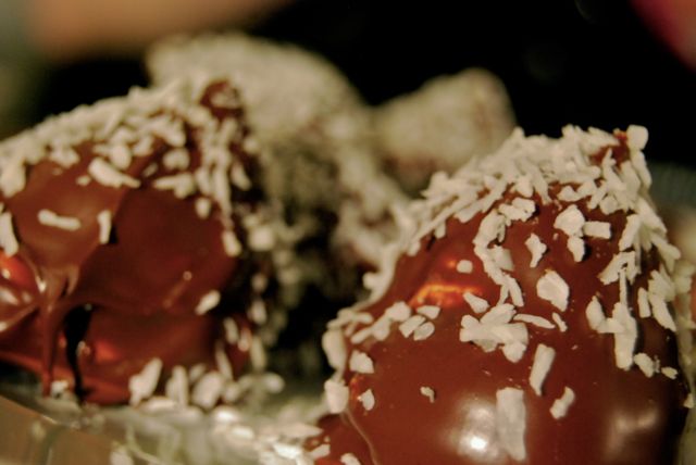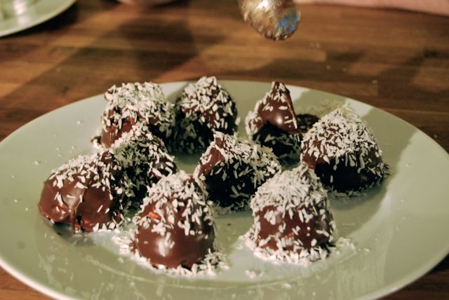 Smelt sjokoladen og delfiafeittet over vatnbad og rør det glatt. Avkjøl det til det så vidt stivnar litt. Dypp eller rull så dei kvite toppane i sjokoladeblandinga til dei er heilt dekka og dryss kokos på dei og set kaldt att så sjokoladen får tid til å setja seg før de et.
