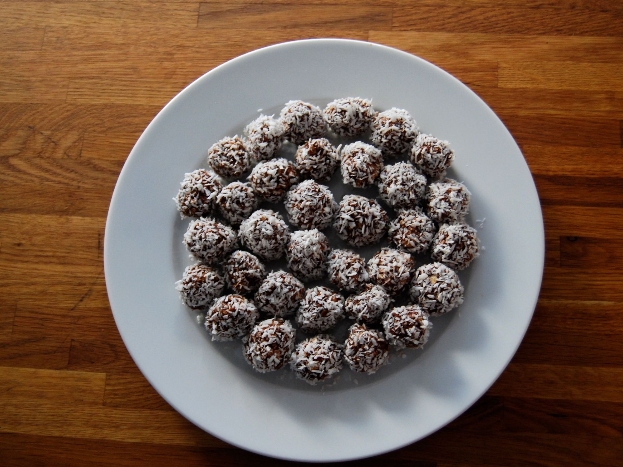 Rør smør/margarin og sukker kvitt. Ha I dei andre ingrediensane (ikkje kokos) og rør det saman tile in deig. Lag små kuler og rull dei I kokos. Set dei kaldt så dei stivner.