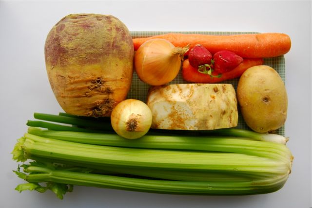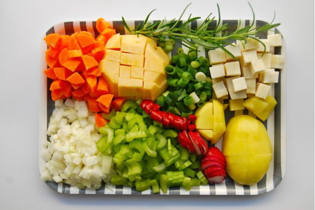 Ta litt grønsaker som du har i kjøleskapet. Her: Stangselleri, vårlauk, kålrabi, sellerirot, potet, lauk, gulrot, redikk, chili, rosmarin.