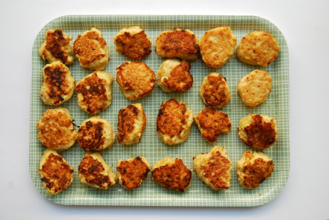 Lag kyllingkjøtbollar av ein pakke kyllingkjøtdeig, ein lauk, eitt fedd kvitlauk, to egg, salt, pepper. Finhakk lauken og bland alt godt saman i foodprosessor. Form små bollar og steik på middels til sterk varme.