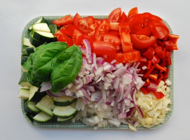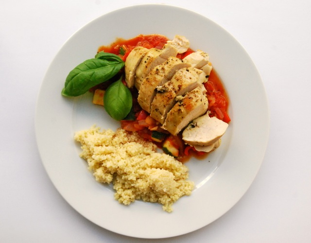 På slike fine sommardagar er det godt med noko litt lett til middag. Sidan me har så mange fine grønsaker om dagen tenkte me at ratatouille var fint. Så hadde me litt kylling og couscous og, og då er det jo lett! Pass forresten på å ikkje røra for mykje i ratatouillen, du lagar jo ikkje ein mos!