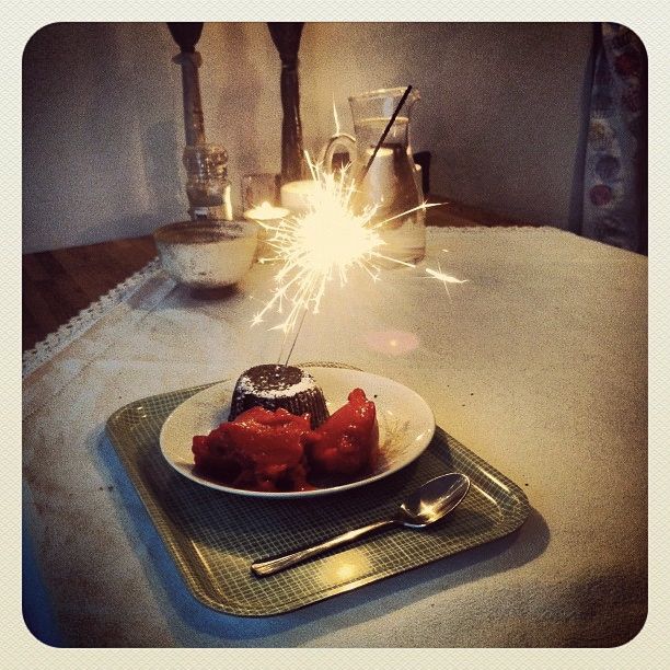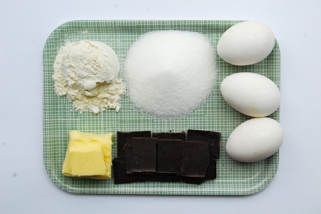 Ein: 95 g mørk sjokolade 60-70 %, 90 g smør, 90 g sukker, 3 egg, 50 g kveitemjøl. Pisk eggedosis, smelt smør og sjokolade og rør det inn og sikt til slutt i kveitemjøl. Ha i seks smurte former eller muffinsformer og steik i om lag 7 minutt på 210 grader.