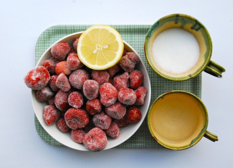To: Ein bolle frosne jordbær, ein god skvis sitronsaft, litt sukker og ein skvett vatn. Kok sukkerlake av litt vatn og ein del sukker. Kok det til sukkeret smelter og til du har ein sirup. Ha frosne jordbær i foodprosessor saman med sitronskvisen og ha i så mykje sukkerlake at knivane i foodprosessoren går rundt. La maskinen gå til massen har blitt heilt glatt, det kan godt ta nokre minutt. Det skal verte slik: