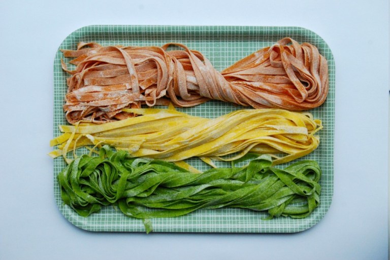 Heimelaga pasta går kjøpt pasta ein høg gang. Det er altså så utruleg godt. Du kan setta til smak og farge etter kva du ønsker deg, og laga i det formatet du vil ha, om det er spagetti, lasagneplater eller tagliatelle. Ein enkel grunnregel er: 100 gram mjøl til eitt egg. Ein del pastaoppskrifter bruker fleire eggeplommer enn eggekviter, og det vanlege er å bruka tipo 00-mjøl, eit durumkveitemjøl med høgare gluteninnhald. Det er og viktig å blanda utruleg godt, at deigen vert mjuk, men fast, og ikkje klissete, og at han får kvila ein times tid før du former han som du vil ha han. Det enklaste er heilt klart å laga pasta med pastamaskin som kjevler ut passelege leivar og lagar spagetti eller tagliatelle eller kva du no vil ha.
