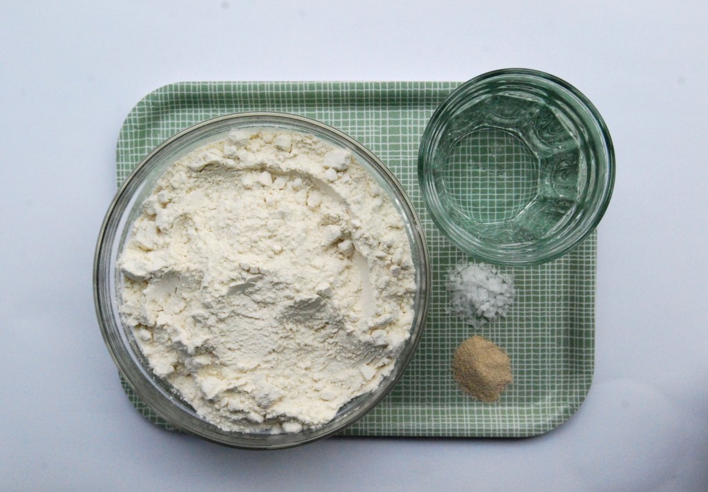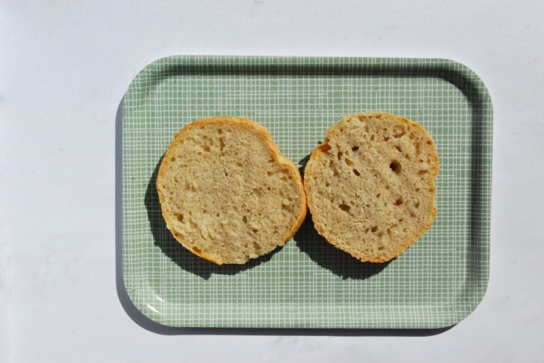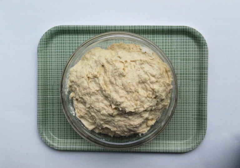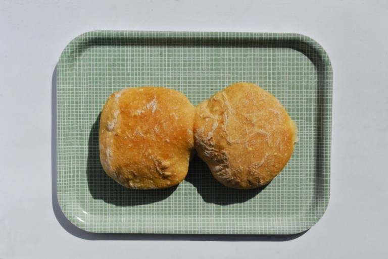 Rør det saman til ein ganske blaut deig, og hev det i tolv til atten timar. Når deigen har heva ferdig er han boblete. Hell deigen ut på eit mjøla bakepapir og brett han over seg sjølv om lag tjue gonger, og brett inn litt mjøl for kvar gong. Deigen vil som sagt gjerne vere litt klissete, men det er heilt greitt. Del deigen i åtte emner og form dei litt runde med hendene og ha dei på steikebrett. Legg eit klede over så dei ikkje tørker ut og la dei etterheva ein halvtime-time. Steik dei så på 220 grader i tjue minutt, og avkjøl på rist. God frukost!