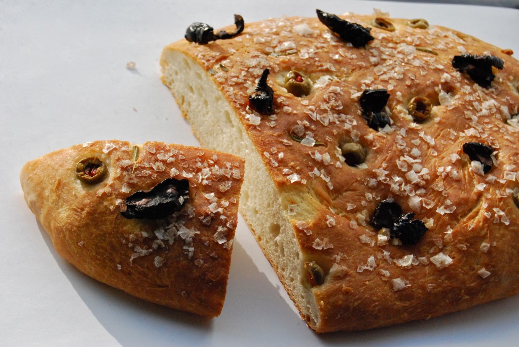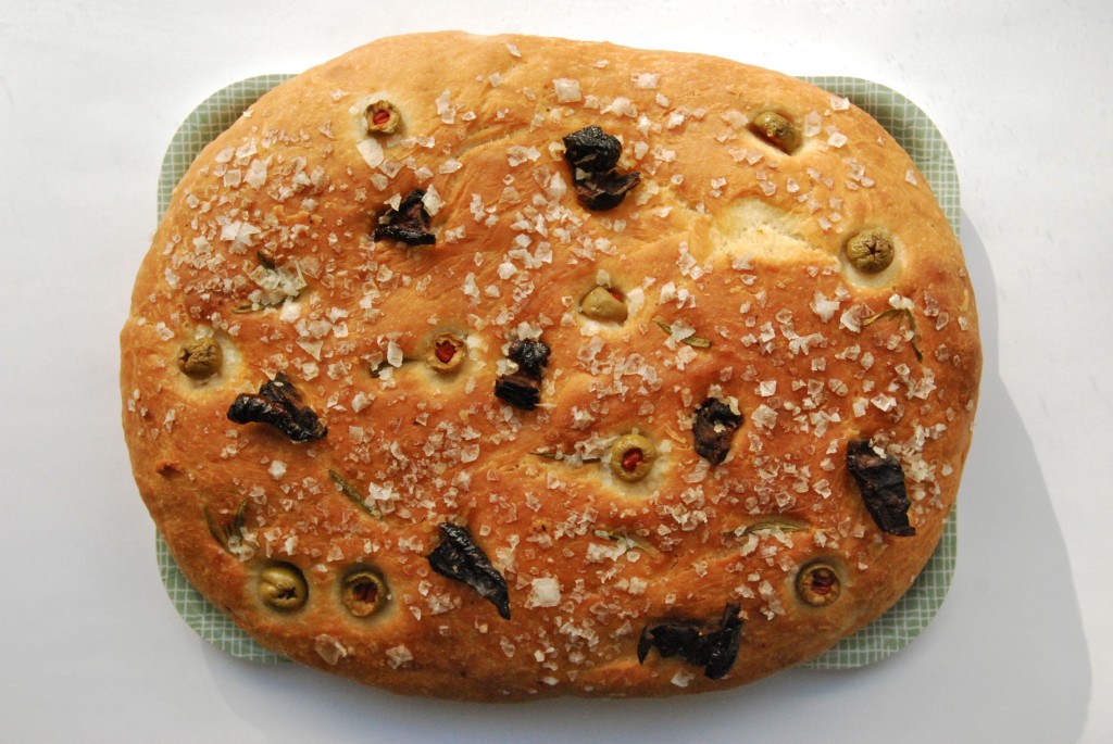 Elt deigen litt og form ein flat leiv. Ha olivenolje på, både under og over, og ha maldonsalt på toppen. Eg hadde og soltørka tomater, litt oliven og timian på oppå, her hadde det nok vore godt med cherrytomater. Etterhev til om lag dobbel storleik att, før du steiker på 180 grader i om lag tjuefem minutt. Avkjøl på rist.