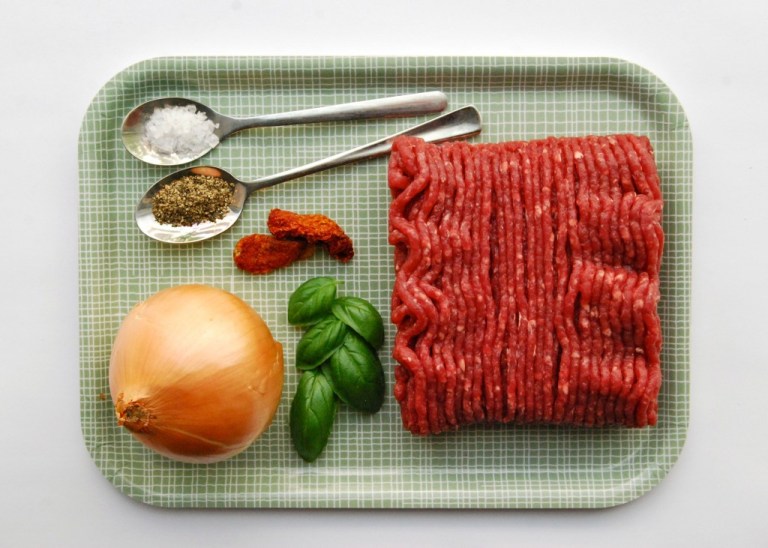 Ta ein pakke karbonadedeig, ein lauk, to soltørka tomater, litt basilikum, salt og peppar. Finhakk lauken og bland alt godt før du former burgerar som du steiker på middels varme.