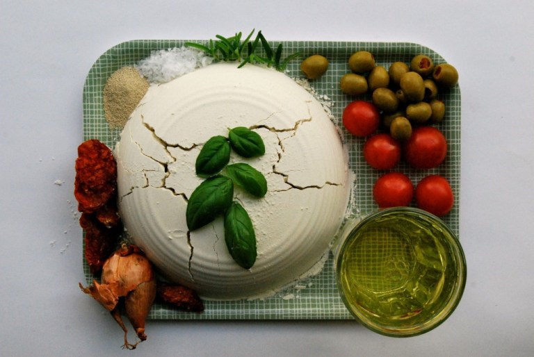 Bland vatnet og gjæren og ha i olje, 1 ts salt, hakka timian, soltørka tomater, kepalauk, oliven og mjøl og elt det godt og lenge til ein fin deig. Det er viktig at deigen er på den klissete sida, og ikkje for tørr. La deigen heva til minst dobbel storleik på ein lun stad.