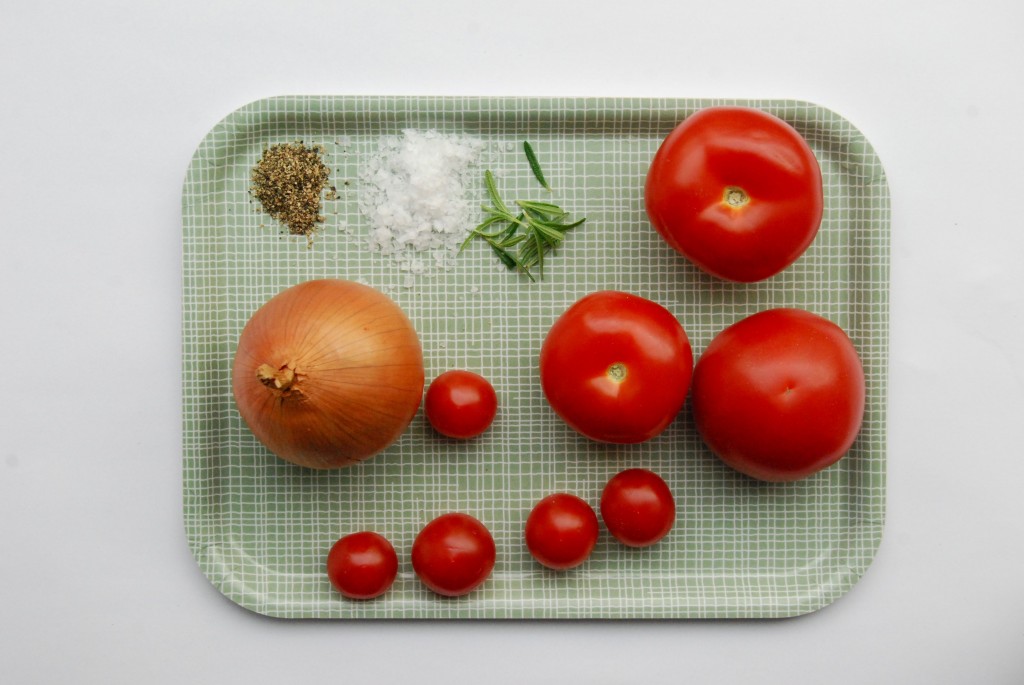 Ta litt tomater, lauk, urter, salt og peppar og finhakk det og kok det lenge og vel. Bruk blender på sausen til det vert ein fin og glatt tomatsaus.