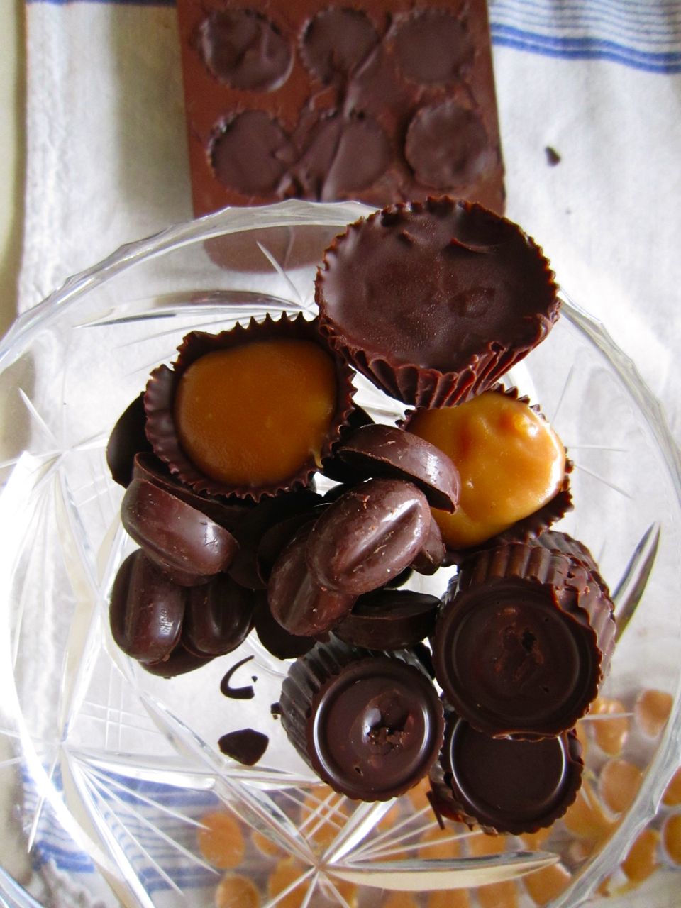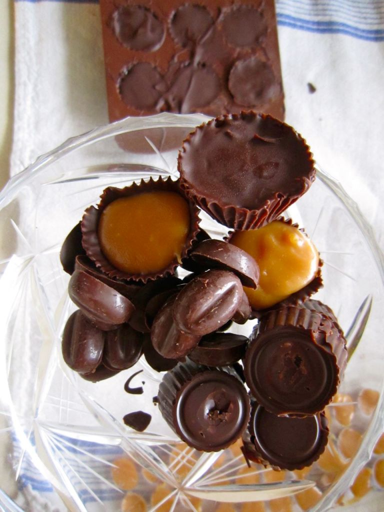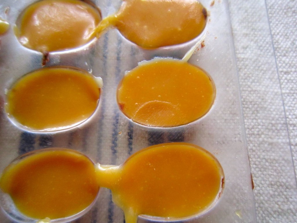 Smør kantane i doble papirformer med sjokolade. Ha i karamellen. Når dette er stivt nok støyper du over sjokolade. Her gjekk eg tom for sjokolade, så nokre karamellar blei utann lokk