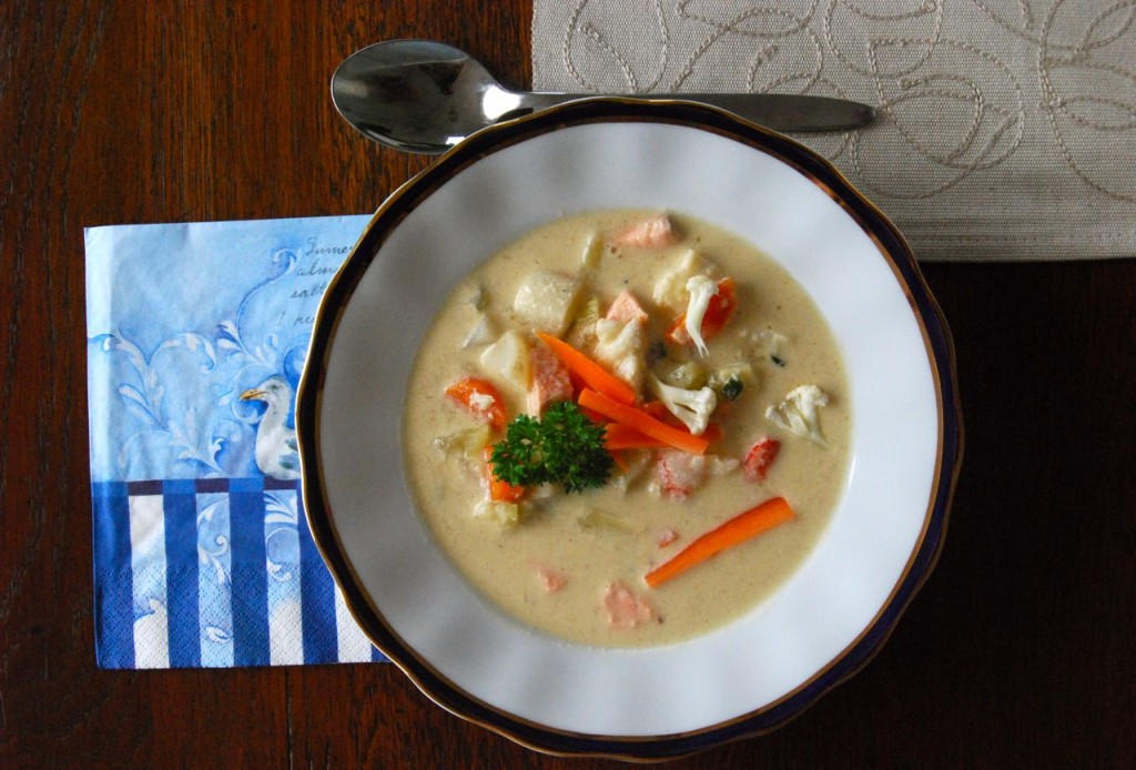Fiskesuppe er kanskje det beste eg veit. Og det er så godt, og så enkelt. Du tek eigentleg det du har av fisk, grønsaker og kraft, og så har du det i i rett rekkefølgje så alt er passe kokt, men ikkje overkokt, og så smakar du til og serverer. Så enkelt. Så godt. Her er dagens fiskesuppe: