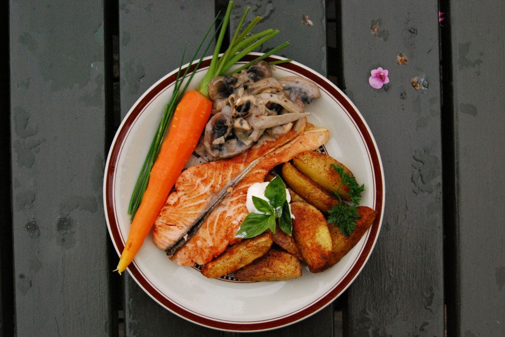 Poteter: Du startar med å varma omnen til 210 grader, vaska og dela poteter i båtar og ha godt med solsikkeolje, salt, peppar og paprikapulver på. Desse skal få steika til dei er møyre og litt sprø. Ha gjerne grillen på mot slutten viss du vil at dei skal verte verkeleg sprø.