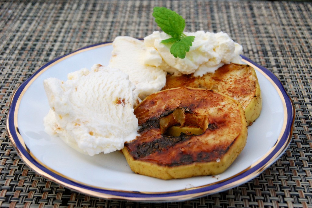 Dryss sukker og kanel på epleskivene på oppsida og legg dei på grillen til sukkeret smeltar og vert glassert og epleskivene vert mjuke. Snu dei så, og ha på sukker og kanel på andre sida og. Server med is og piska krem. Fint!