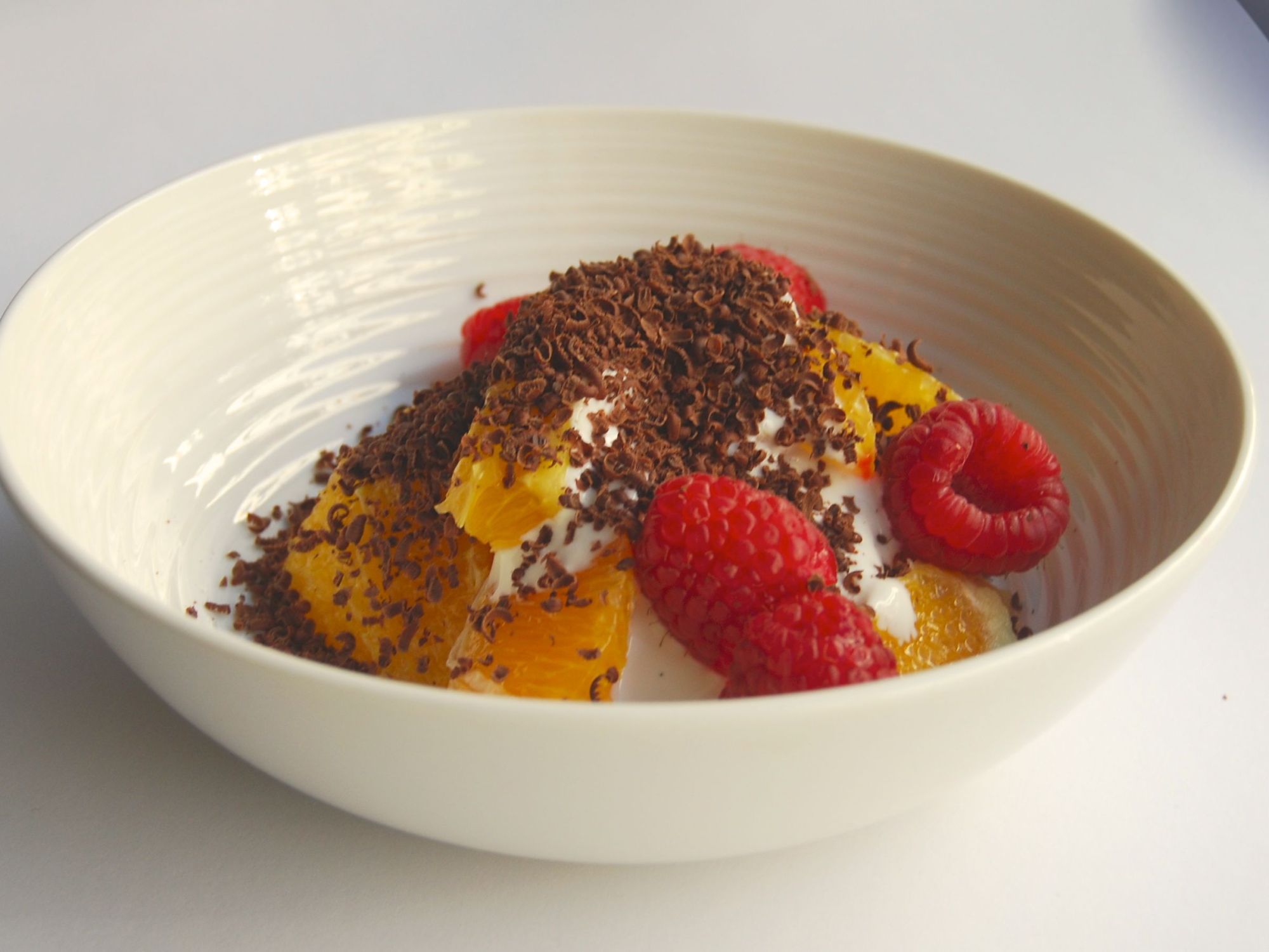 Skjær den eine appelsina i båtar, hell litt bringebær over og skvis over safta av ei halv appelsin. Ha på litt vaniljekesam og finriv litt mørk sjokolade over. Topp!
