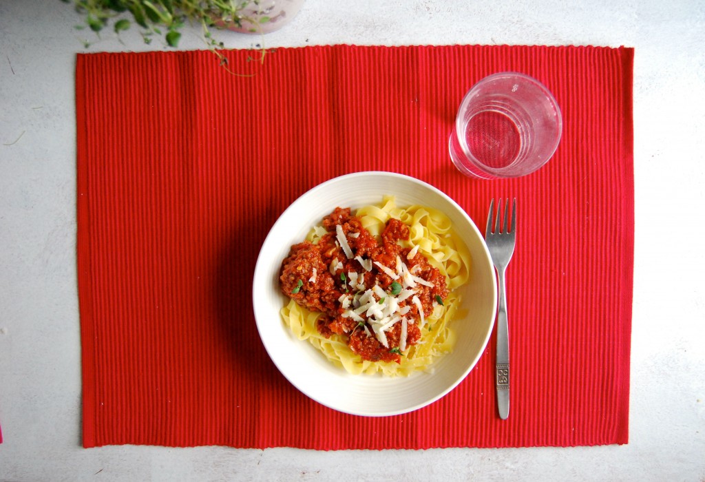 Pasta med kjøtsaus er ekstremt takknemleg mat. Bokstaveleg talt når kjærasten din er pastaentusiast, og så er det jo verkeleg praktisk når du kan få brukt opp alle grønsaksrestane nedst i kjøleskåpet. Dette er i allefall ein sjukt bra pastasaus.
