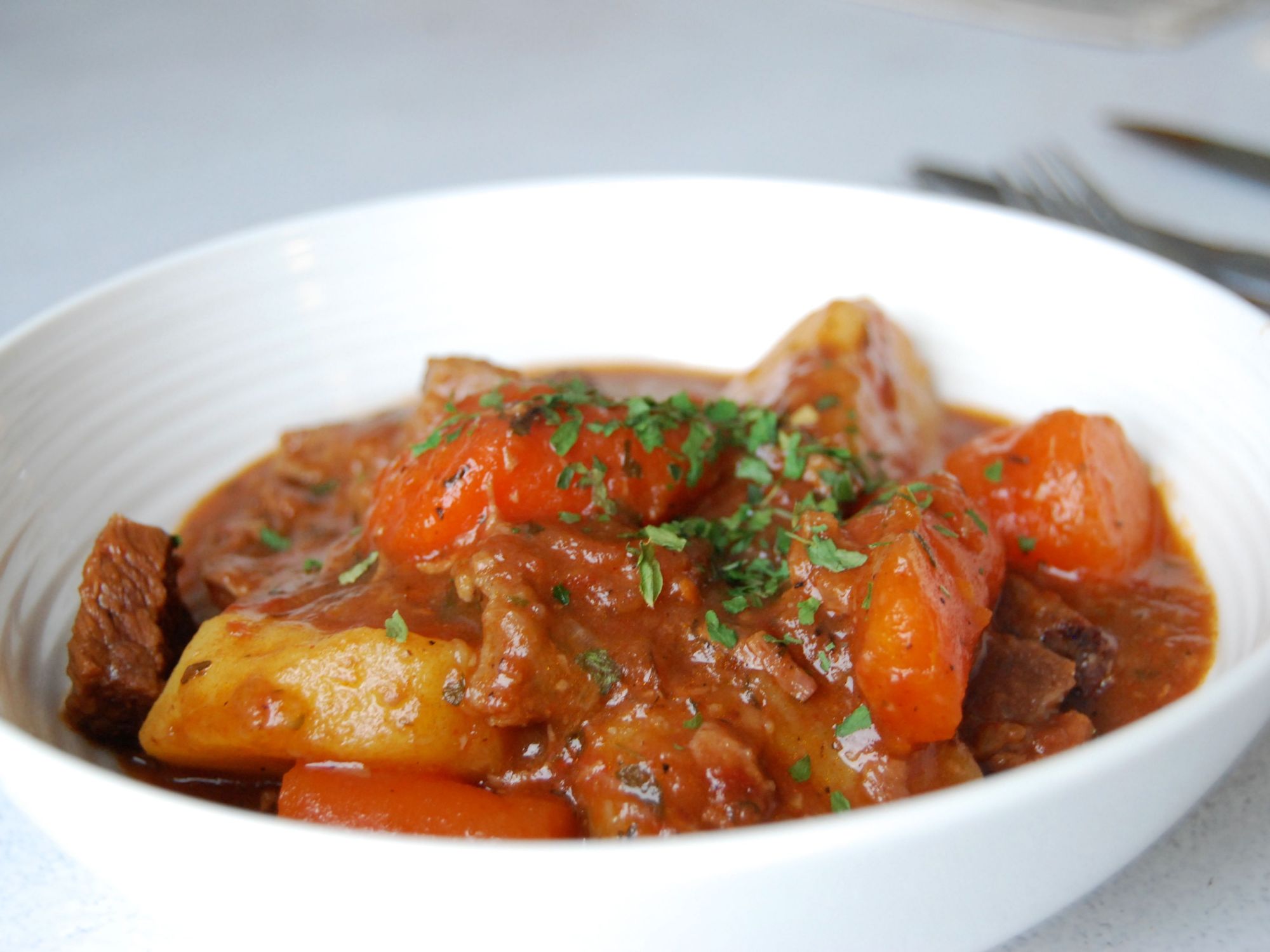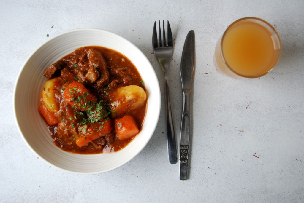 Middag som lagar seg sjølv er himla lurt. Sleng alt i ei gryte, skriv nokre kapittel til, og så er det mat. Eller gå den søndagsturen. Eller kva som helst. Her treng du berre gi alt eit oppkok og så set du gryta med innhald i steikomnen i to og ein halv time, så er det gjort. Kjempebra. Denne oppskrifta held til fire personar, eller til middag for to i to dagar. Blir ikkje enklare enn det.