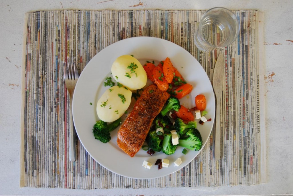 Steikt laks og brokkoli er av tinga me åt mykje av då eg var lita. Verkeleg mykje. Ein av tinga eg lærte av far min var at ein ikkje skal overkoka grønsakene. La dei stakkars gulrøtene og brokkoliane få behalda form, farge, vitaminer og smak, liksom! Dette er ein rett som tek så lang tid som det tek å koka potetene. Fisken skal berre steika nokre få minutt. Gulrøtene og brokkolien skal og berre varmast ganske kjapt. Viss du har kokte poteter frå før og lagar potetstappe eller går for berre gulrøter og brokkoli burde du ha mat på bordet på eit greitt kvarter. Hurtigmat, altså!