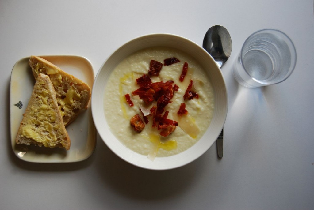 Denne suppa er fin og smakar mykje betre enn bilete og namn skulle tilsei. Eg liker det sprø og salte oppå! Denne oppskrifta held til middag til to svoltne eller forrett til fire. Du kan forresten bytta ut sellerirot med jordskokk eller persillerot viss du vil, det er og ganske godt. Du veit, sånn for variasjon.