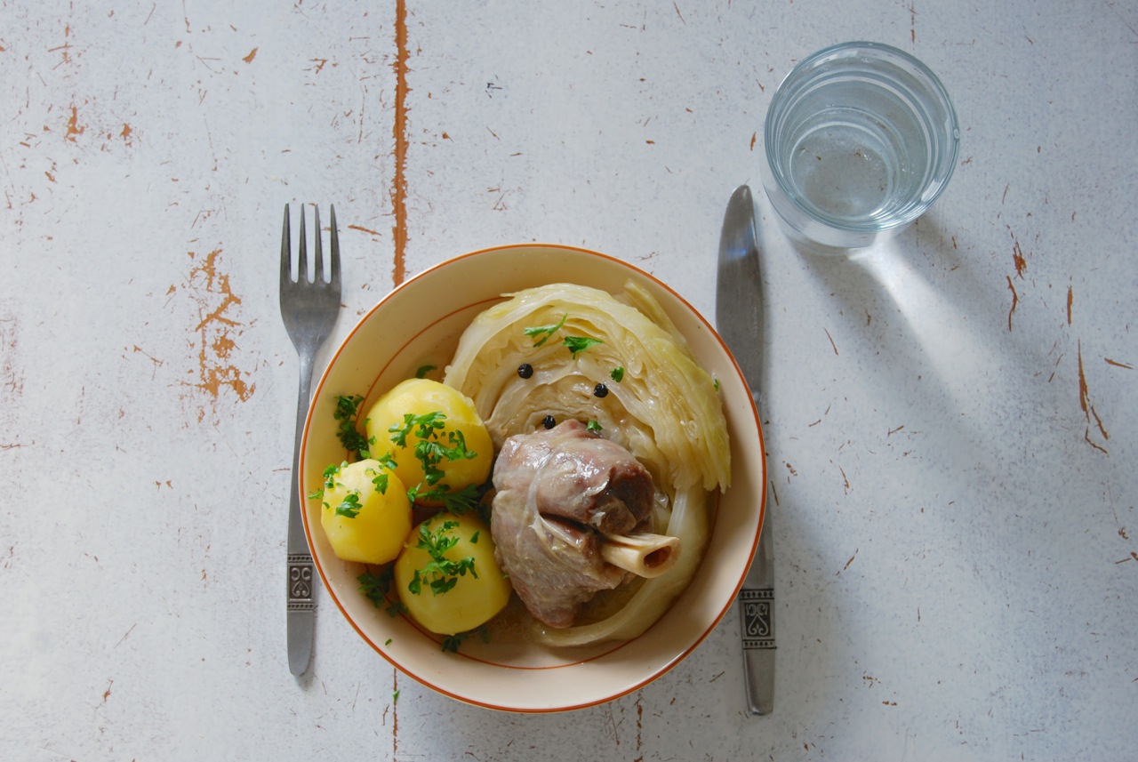 Hell over kokande vatn. Kok opp og la det trekka under lokk til kjøtt og kål er møyrt. Ikkje rør i gryta, berre drei kjelen litt no og då, så svir det seg ikkje. Viss vatnet kokar vekk må du ha på meir – det skal ikkje koka tørt.